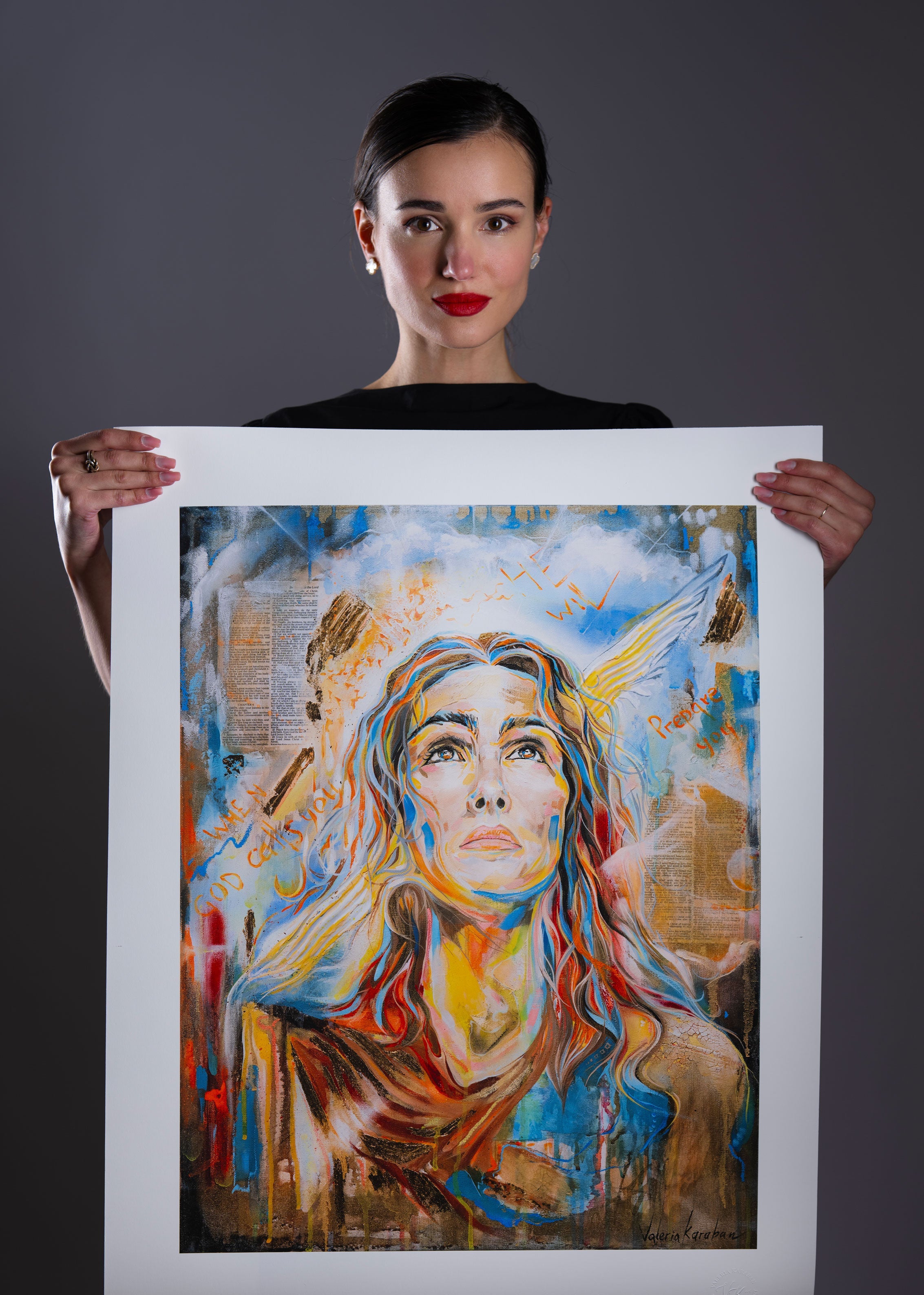 The glowing neon inscription, “When God calls you, He will prepare you,” reveals the essence of the painting.