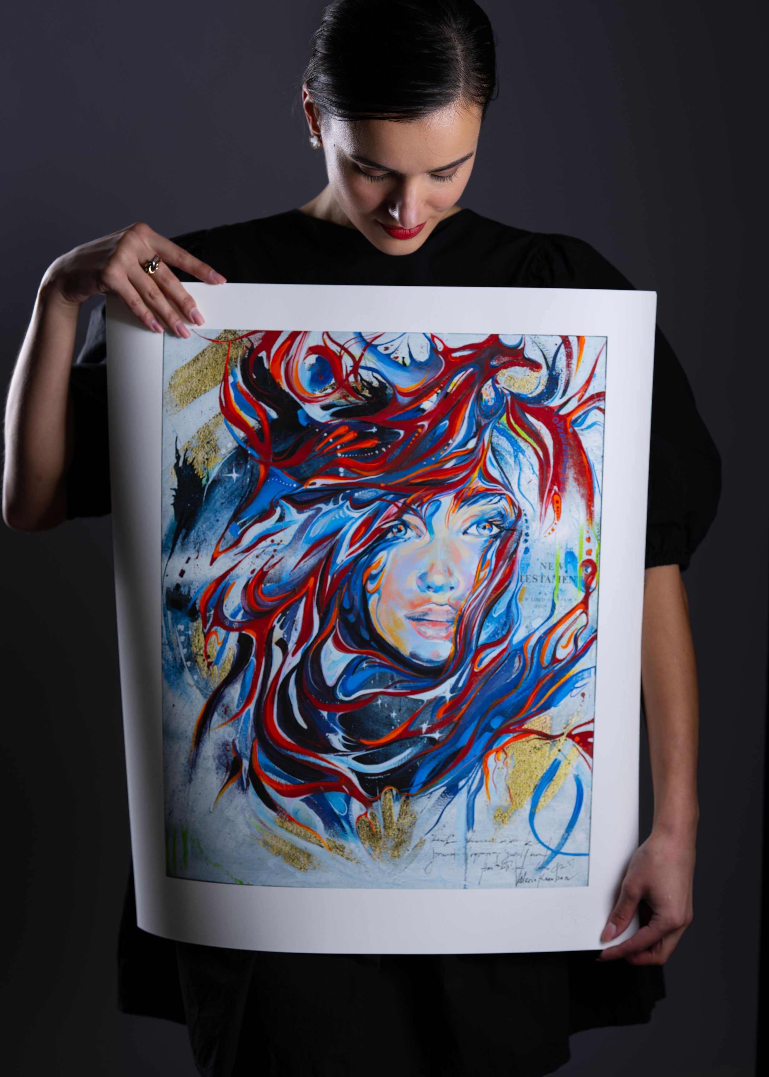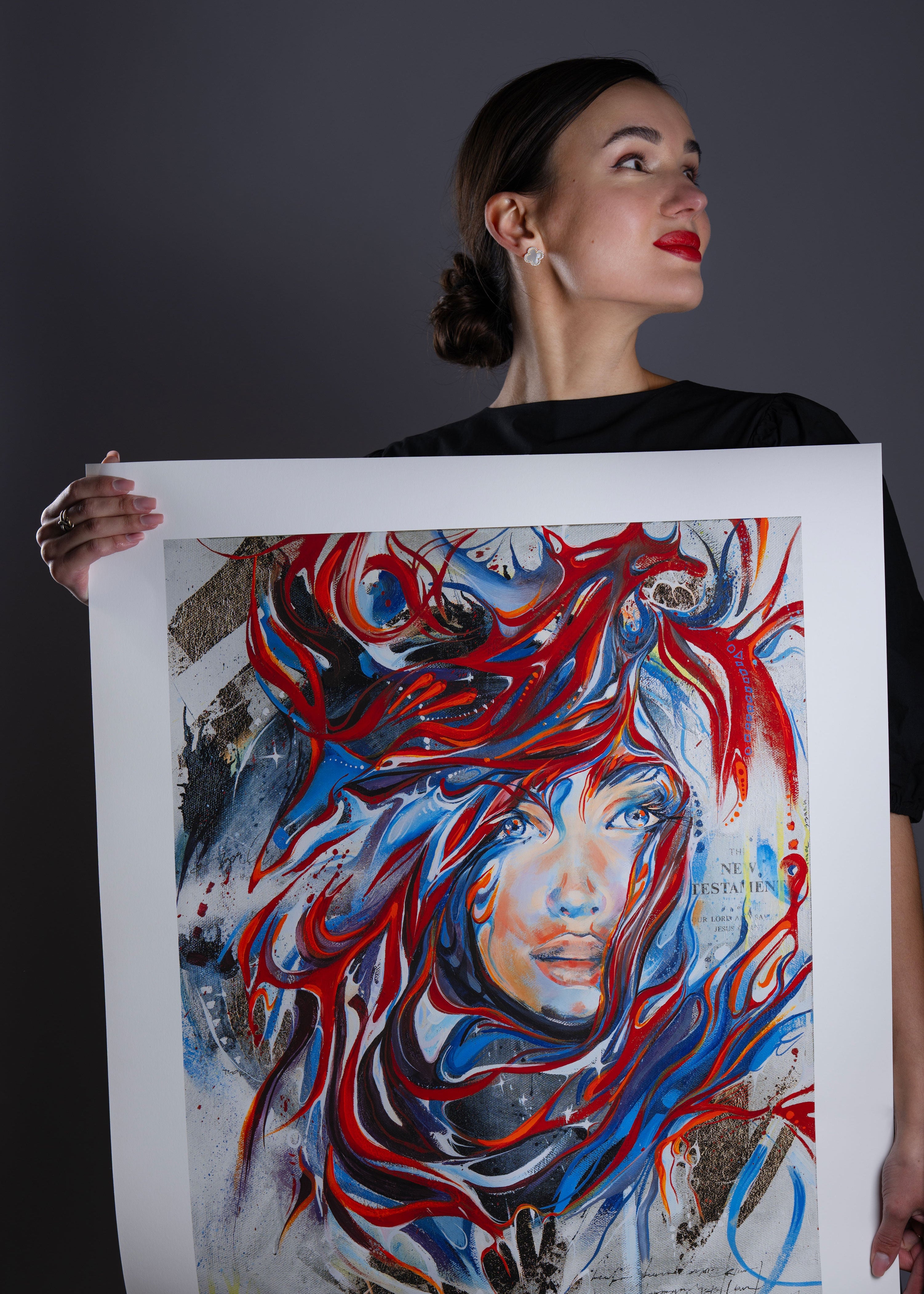 On the right side of the painting, an old page from the Bible appears, the cover of the New Testament.